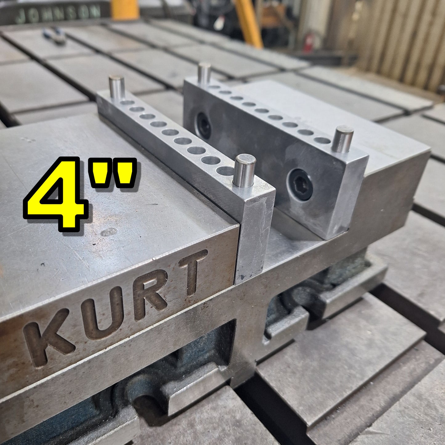 Hand Made in Northern Wisconsin, these 4" jaws are the best bang for your buck. Milled from solid 4140 Prehard Steel, these jaws are built to last. Pins are hardened and ground to fit in the holes and can be placed however you need to hold odd or complex parts. Made in small batches to ensure quality and tumbled for a beautiful finish.